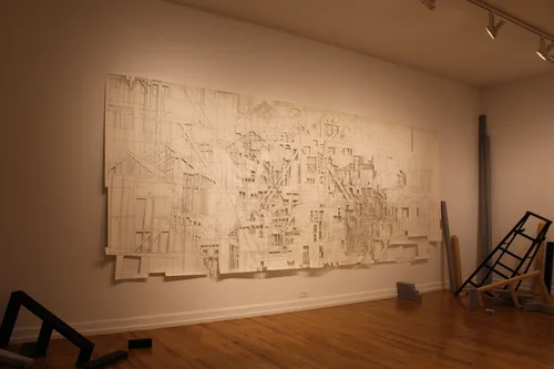 The Pittsburgh Center for the Arts exhibition space undeniably holds a split character. With both its initial purpose as a residence and as a “white box” gallery space, it felt appropriate to construct an exhibit around artists who principally create with a direct relation to the space that their work occupies. Furthermore, with the expansion of the 2011 Pittsburgh Biennial to involve both locally based artists and artists who have left Pittsburgh to work elsewhere, it prompted me to organize an exhibit that reflects on what “regional” means as a context for viewing art.